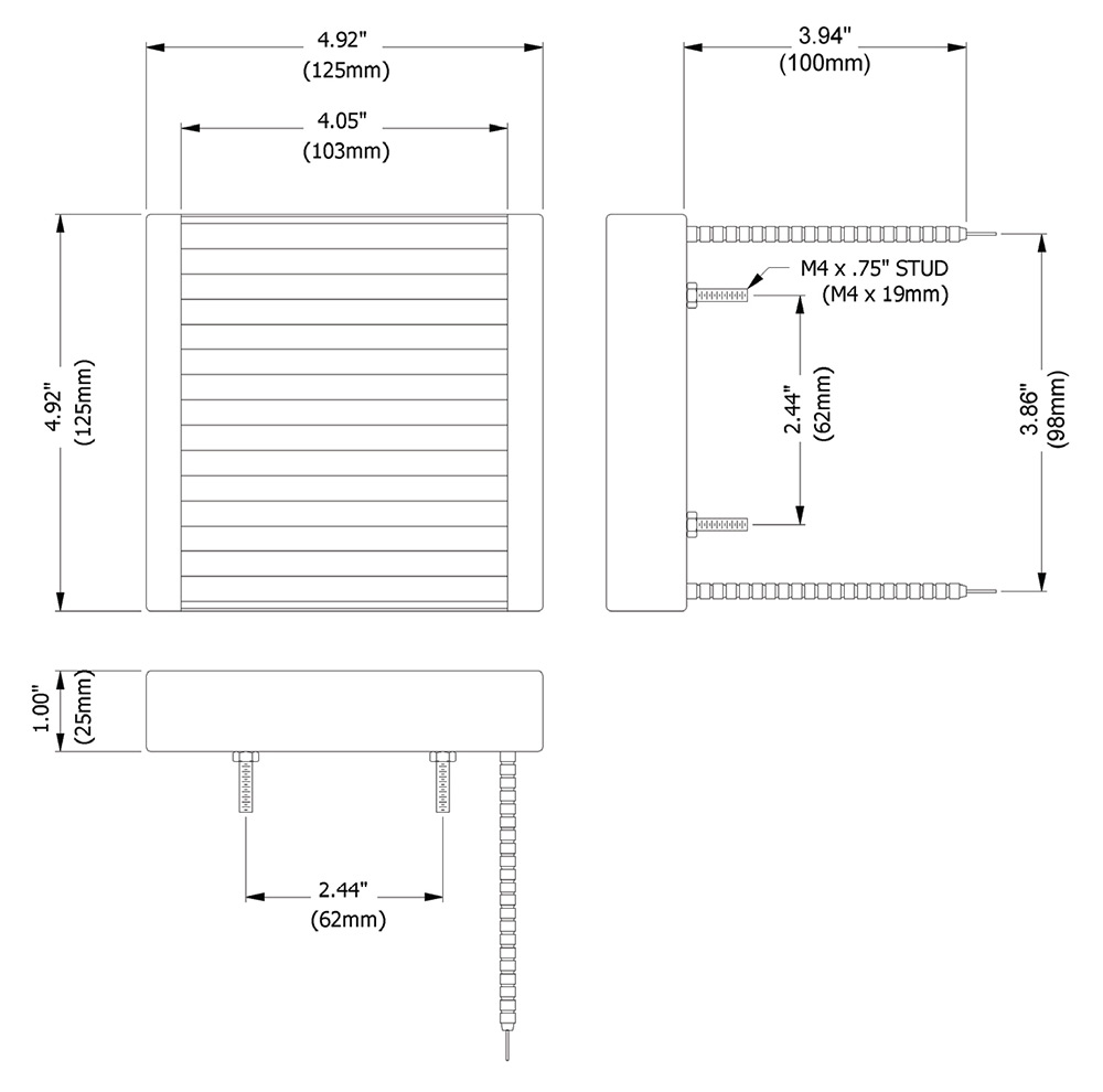 Overall Size: 62mm x 62mm Radiaton: 62mm x 40mm Wattages: 75-150-200 W