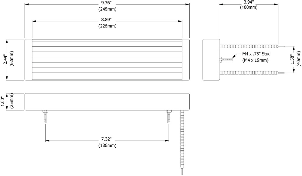 Overall Size: 248mm x 62mm Radiaton: 226mm x 62mm Wattages: 300-400-500-750-1000 W