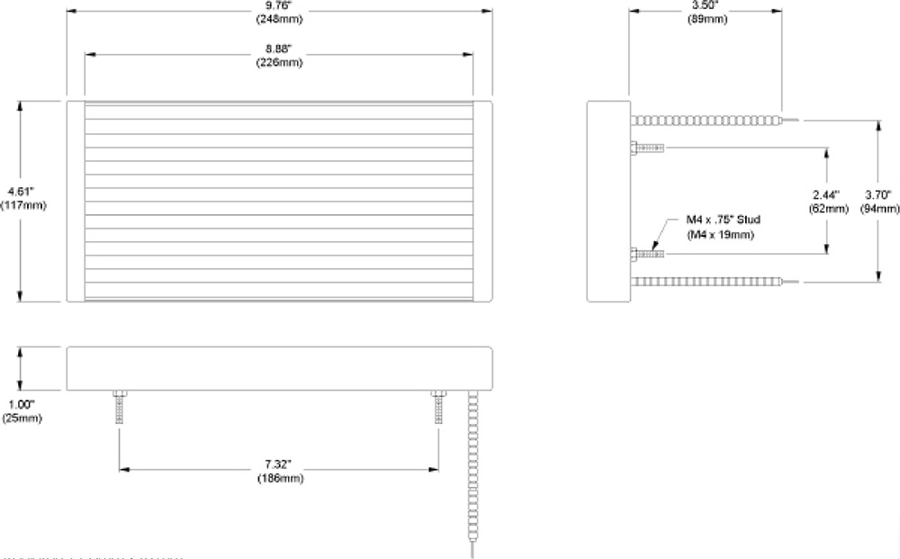 Overall Size: 248mm x 117mm Radiaton: 226mm x 117mm Wattages: 750-1000-1250 W