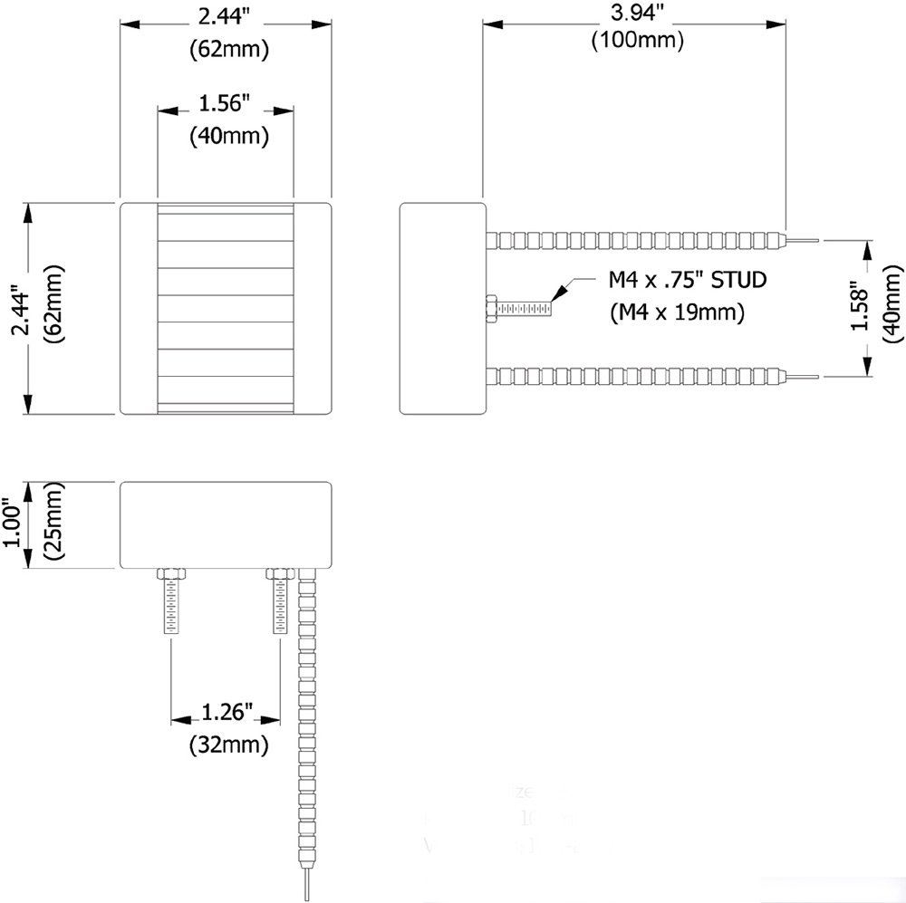 Overall Size: 62mm x 62mm Radiaton: 62mm x 40mm Wattages: 75-150-200 W