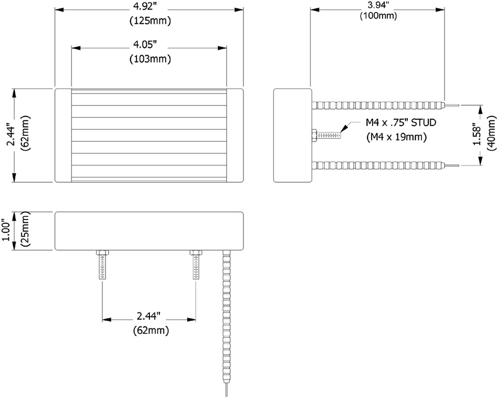 Overall Size: 125mm x 62mm Radiaton: 103mm x 62mm Wattages: 150-200-325-500 W